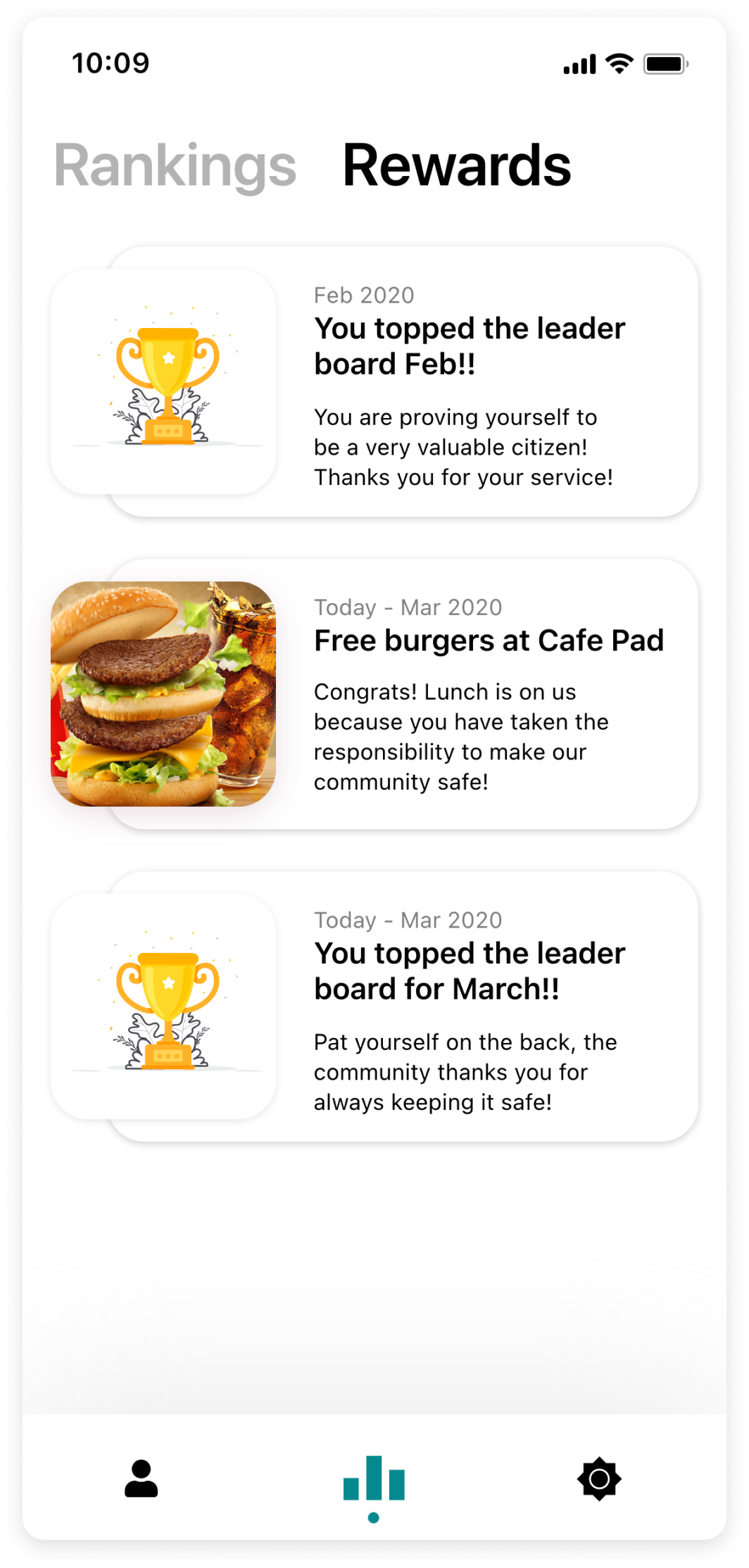 In our application, we designed a rewards section that displays the badges and vouchers won by the user for being good citizens of the society. We carefully craft messages to convey a sense of pride and accomplishment.