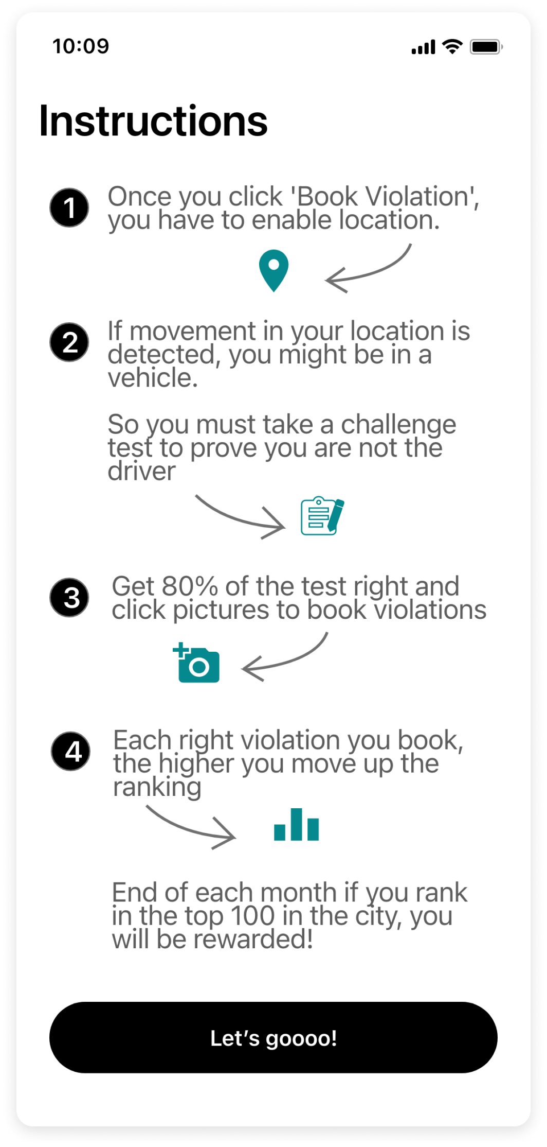 To solve the second usecase, we introduced a feature that diables the ‘Book Violation’ CTA when any movement is detected by combination of the phone’s gyroscope and GPS based location. It will then trigger a quick challenge test to prove that the user is not the driver. The questions in the test is uniquely designed to test the attention of the user. Successful completion of the test will prove that the user is not distracted from focusing on the road. But if there is no constant motion detected (ie. not in vehicle), the user is directed straight to the camera without the test.